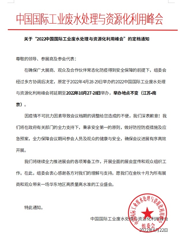 在確保廣大展商、觀眾及合作伙伴常態化防疫得到安全保障的前提下,組委會經過多方協調后決定,原定于2022年4月28-29日舉辦的2022中國國際工業廢水處理與資源化利用峰會將延期至2022年10月27-28日舉辦,舉辦地點不變(江蘇?南京)。